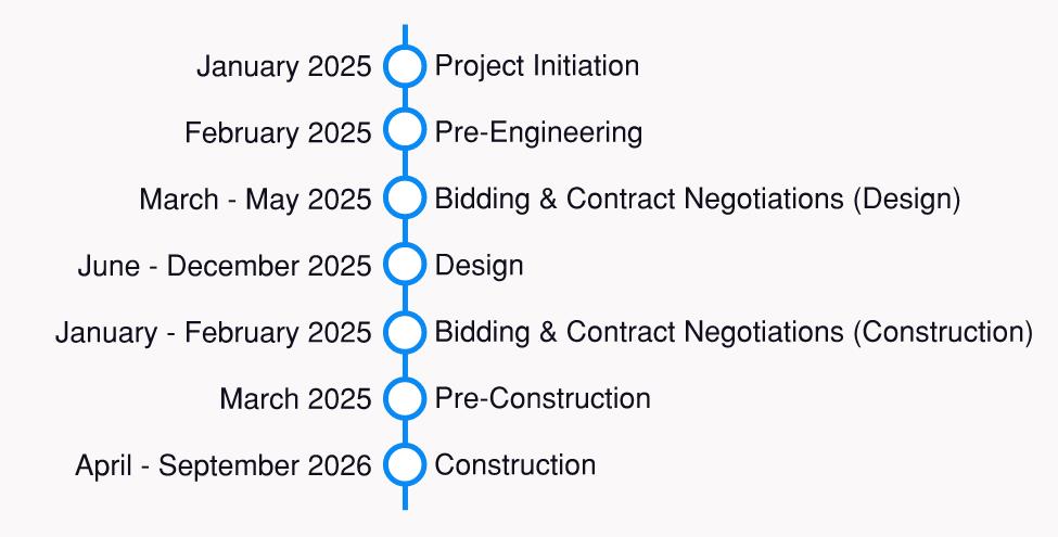 सड़क के उत्तरी आधे हिस्से को निजी डेवलपर्स द्वारा डिजाइन और निर्माण किया जाएगा, जिसकी अनुमानित पूर्णता तिथि 2025 की गर्मियों में होगी। शहर सड़क के दक्षिण आधे हिस्से के डिजाइन और निर्माण का प्रबंधन करेगा। अनुमानित डिजाइन और निर्माण पूरा होने की तारीखें क्रमशः दिसंबर 2025 और सितंबर 2026 हैं।