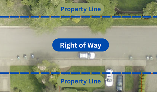 "राइट-ऑफ-वे" उस भूमि को संदर्भित करता है जो शहर या स्थानीय सरकार के स्वामित्व में है, और यह हमेशा पक्की सड़क के किनारे तक सीमित नहीं होती है। इसका मतलब यह है कि ड्राइववे, भूनिर्माण और पैदल मार्ग कभी-कभी राइट-ऑफ-वे में स्थित हो सकते हैं। कई संपत्ति मालिक गलती से मानते हैं कि संपत्ति की रेखा सड़क के किनारे पर समाप्त होती है, लेकिन अक्सर ऐसा नहीं होता है।